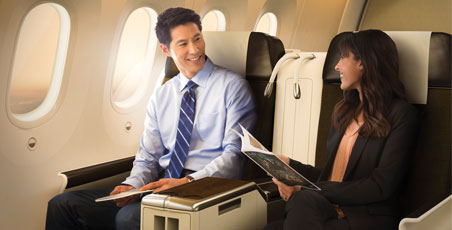 The Royal Brunei Airlines 787 Dreamliner Business Class cabin features contour seats that fully recline to a flat bed with 11% larger surface than the in-flight beds of most aircrafts. Along with a plush duvet and larger pillow, the Business Class seats of the Dreamliner truly provide optimum comfort for a peaceful rest.
